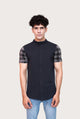 Black & Blue Checkered Button Up Shirt is a versatile addition to your wardrobe this season. Features soft black fabric, contrast checkered pattern fabric on sleeves, grandad collar, and button-up style. This machine wash T-shirt is an ideal choice for a modern man.